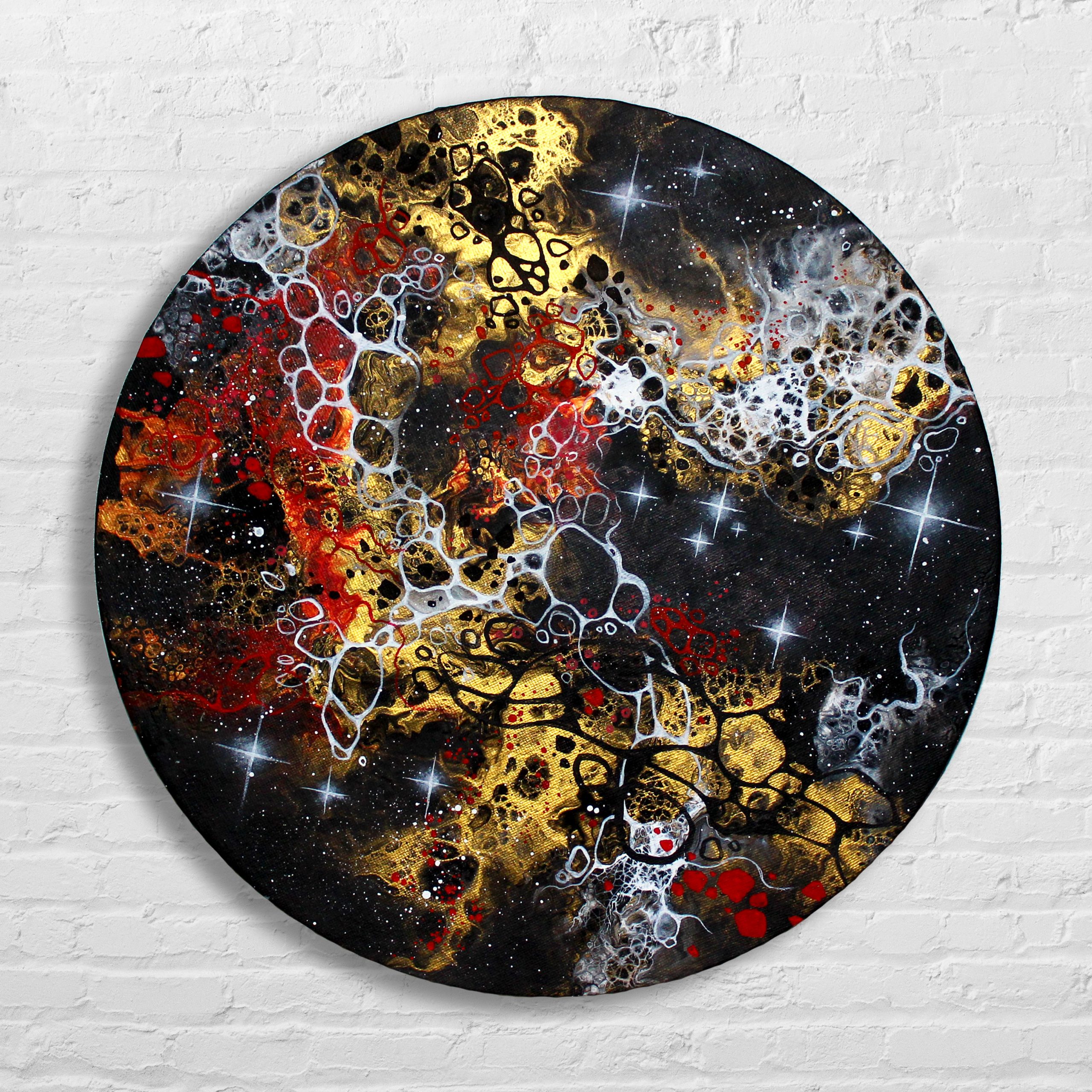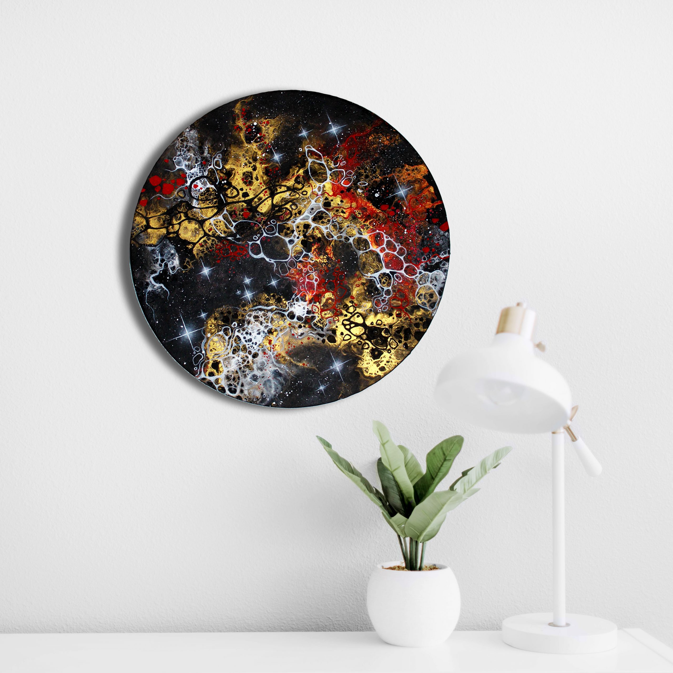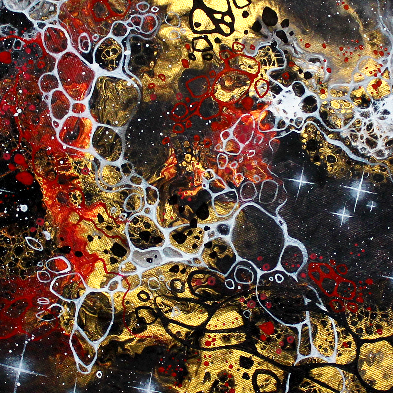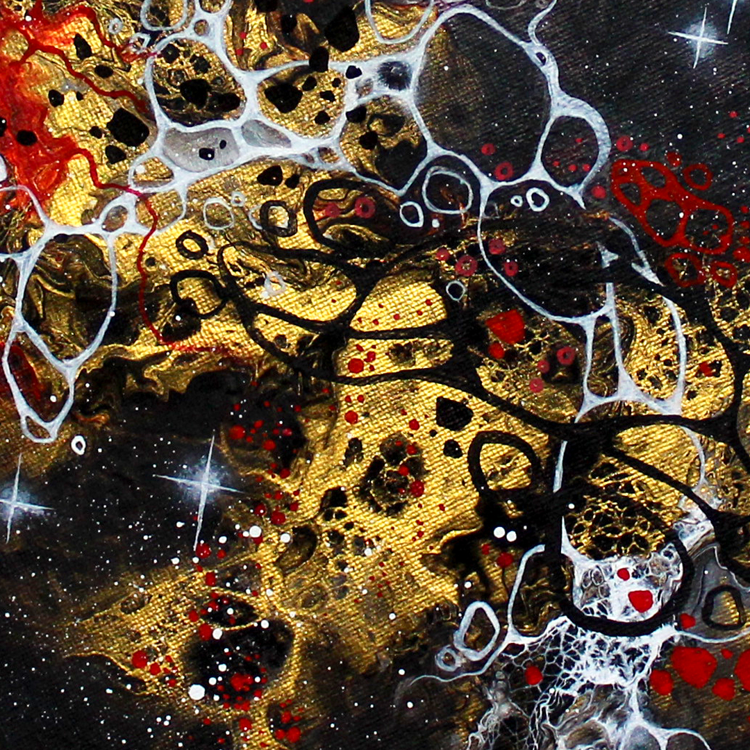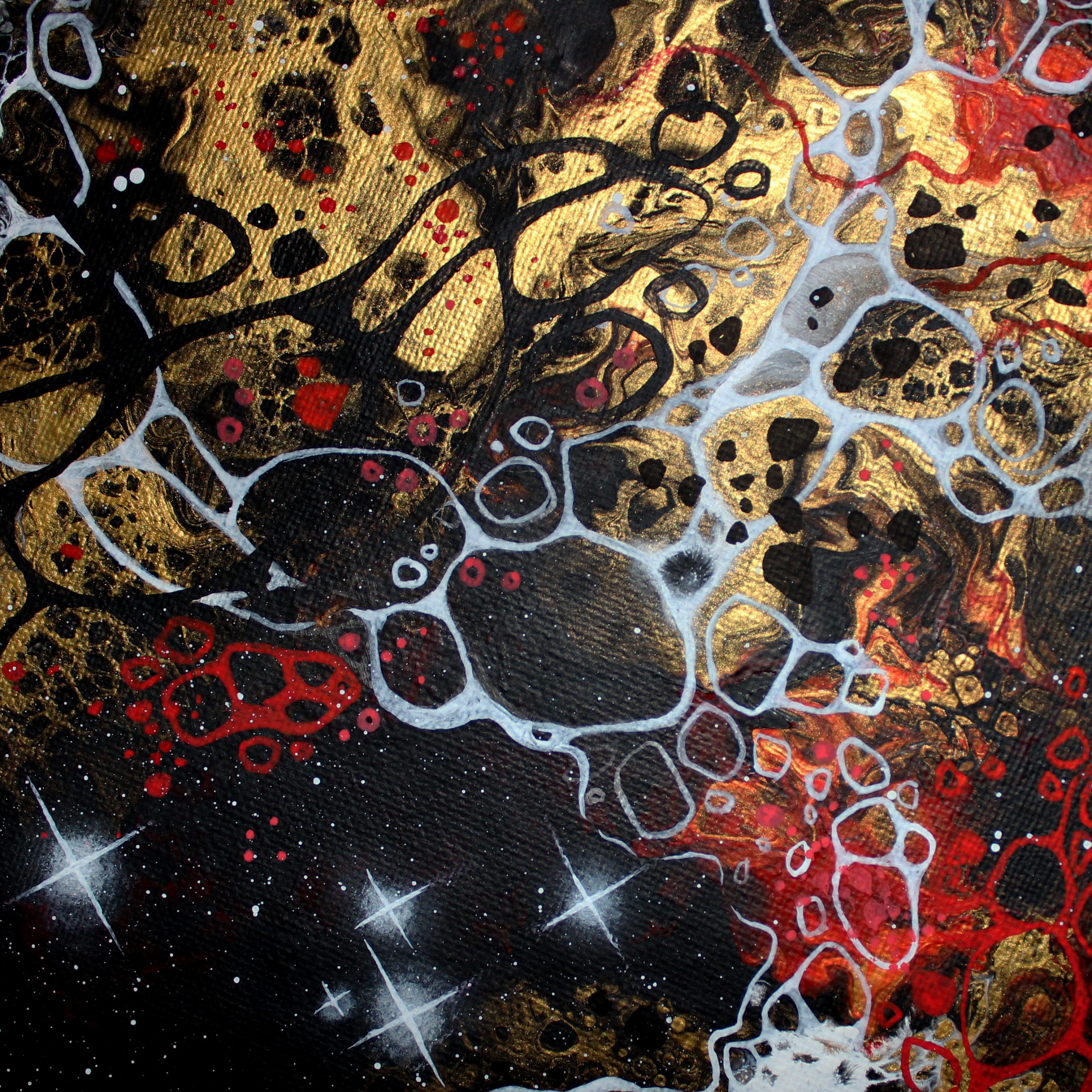 Ici, la cliente a choisi les couleurs : noir, blanc, rouge et doré ! J’ai donc décidé de mettre en valeur le rouge et le doré avec un fond noir très sombre, agrémenté d’étoiles blanches et de détails colorés.