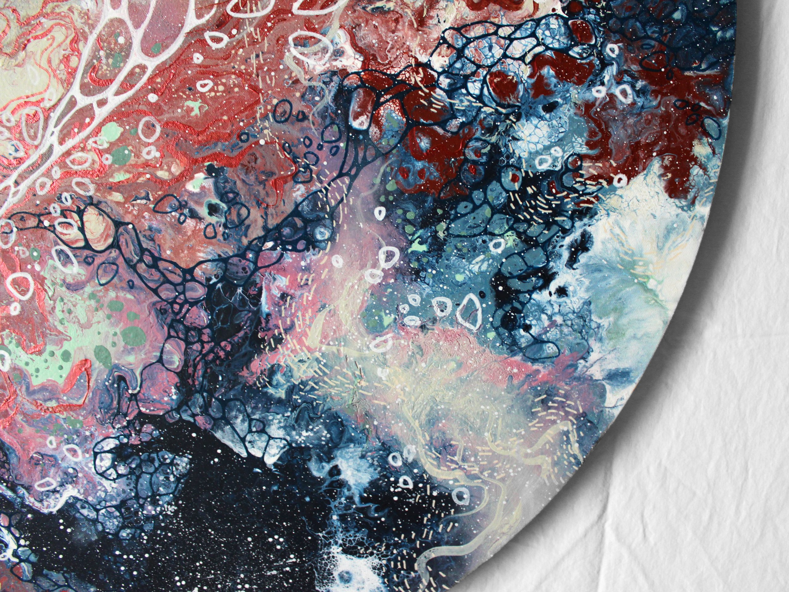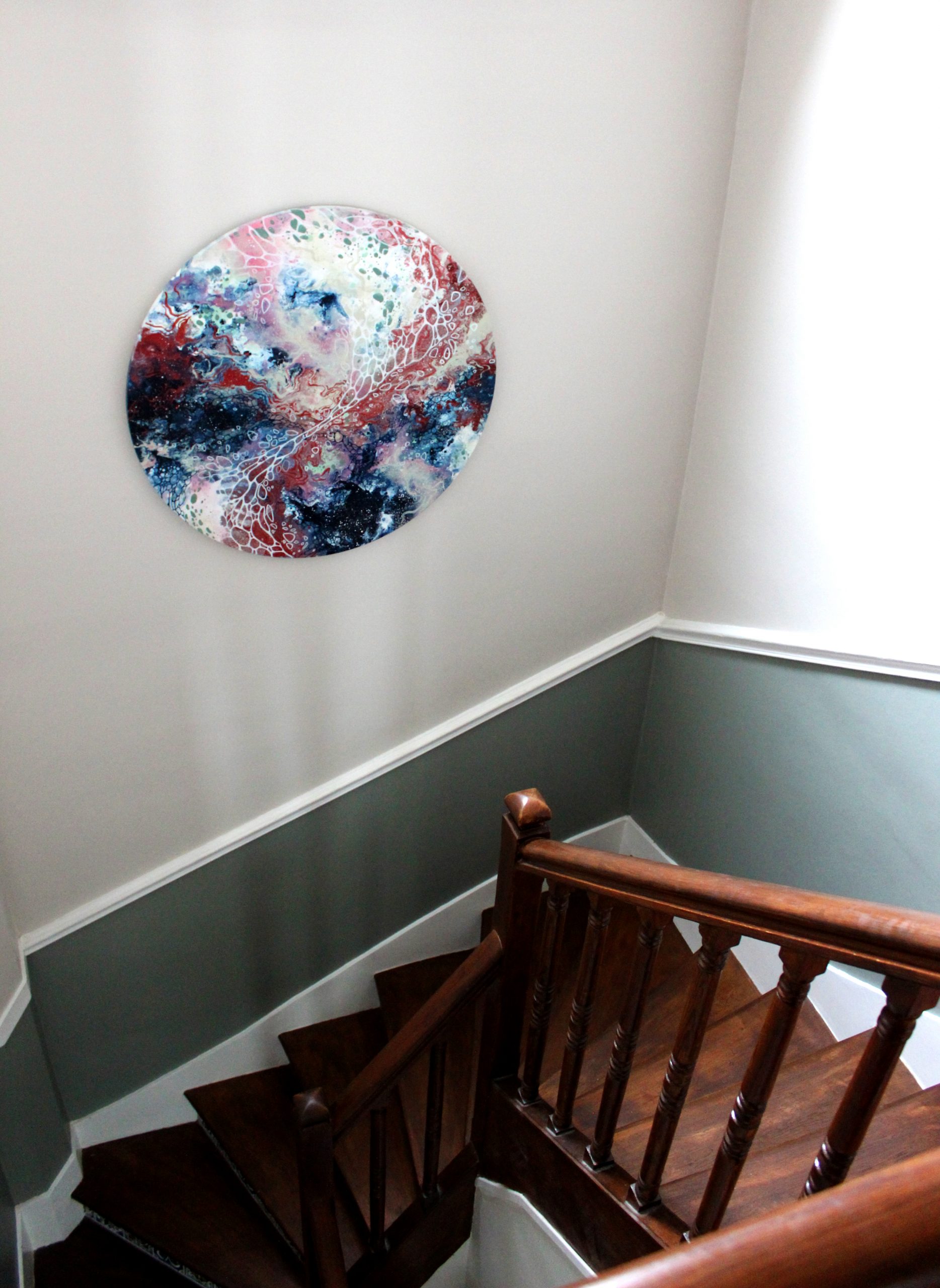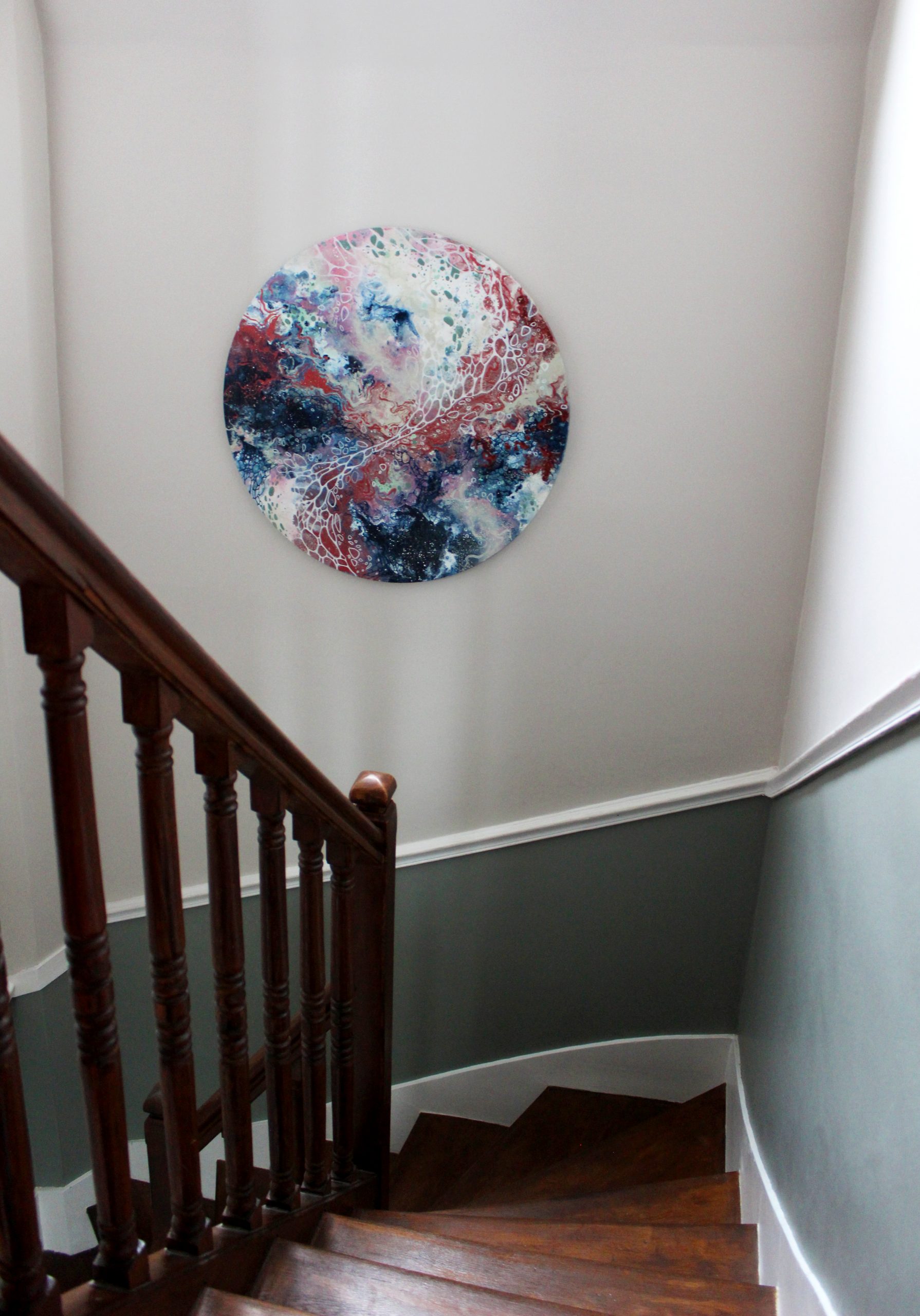 Une commande personnalisée imaginée pour une montée d’escalier. Après quelques propositions de compositions et de couleurs, la cliente a opté pour une grande toile ronde aux couleurs douces et calmes. Placée au milieu de ce mur, elle est visible depuis le rez-de-chaussée mais aussi depuis l’étage. C’est un vrai plaisir d’avoir pu créer une toile pour un si bel espace . J’ai choisi le titre en fonction de ce que les formes et couleurs m’évoquaient : un paysage rêvé et imaginaire.