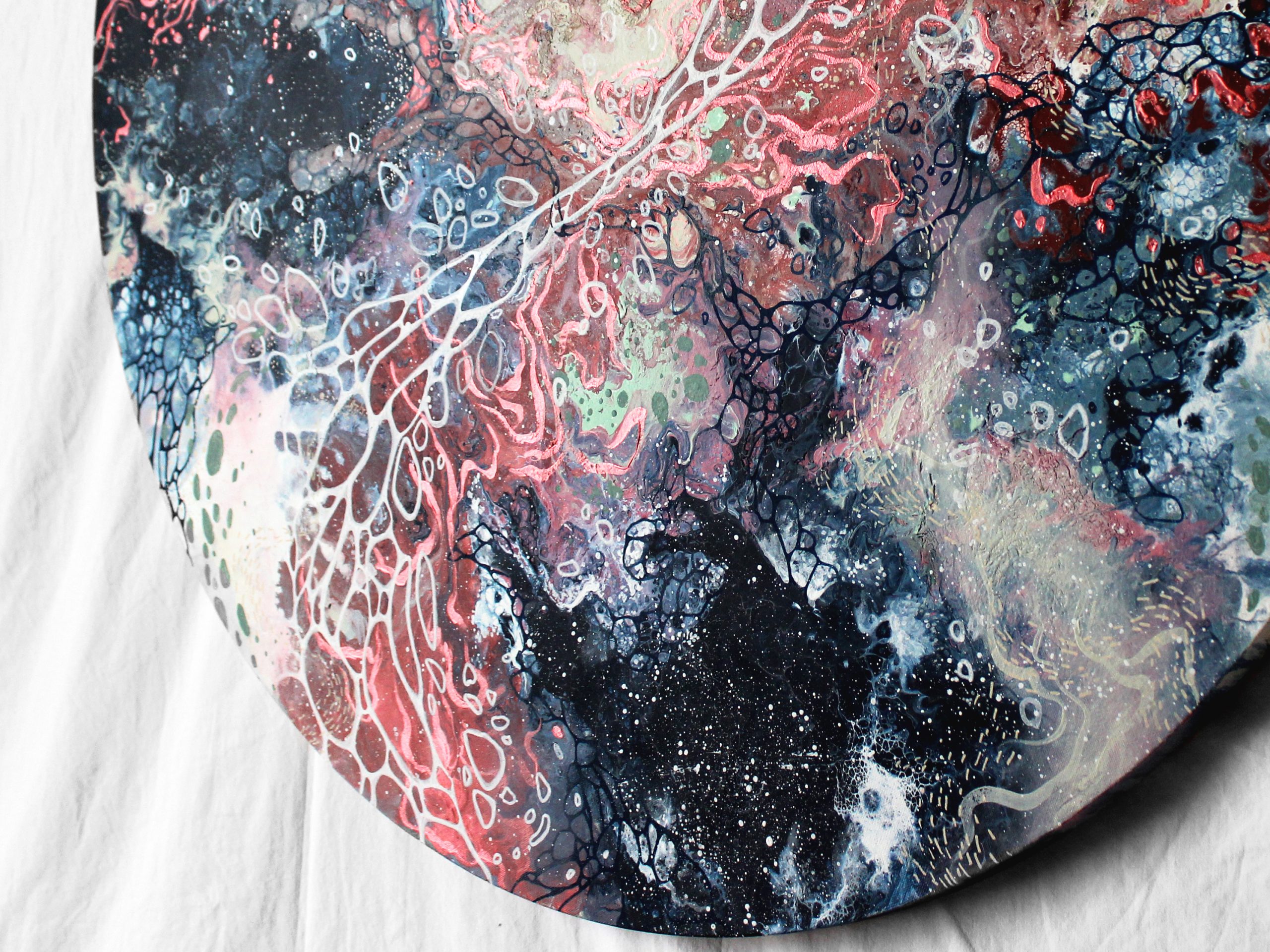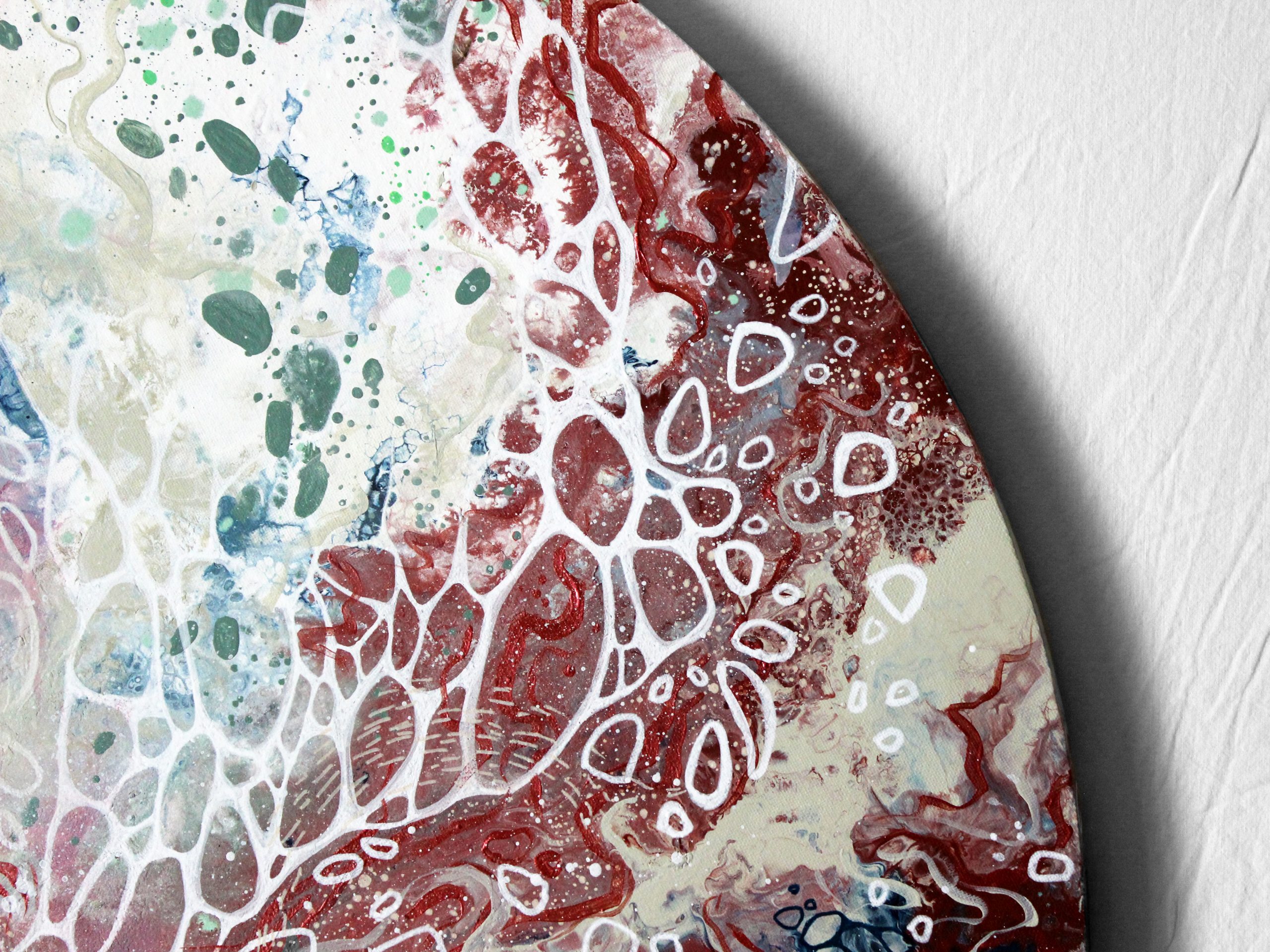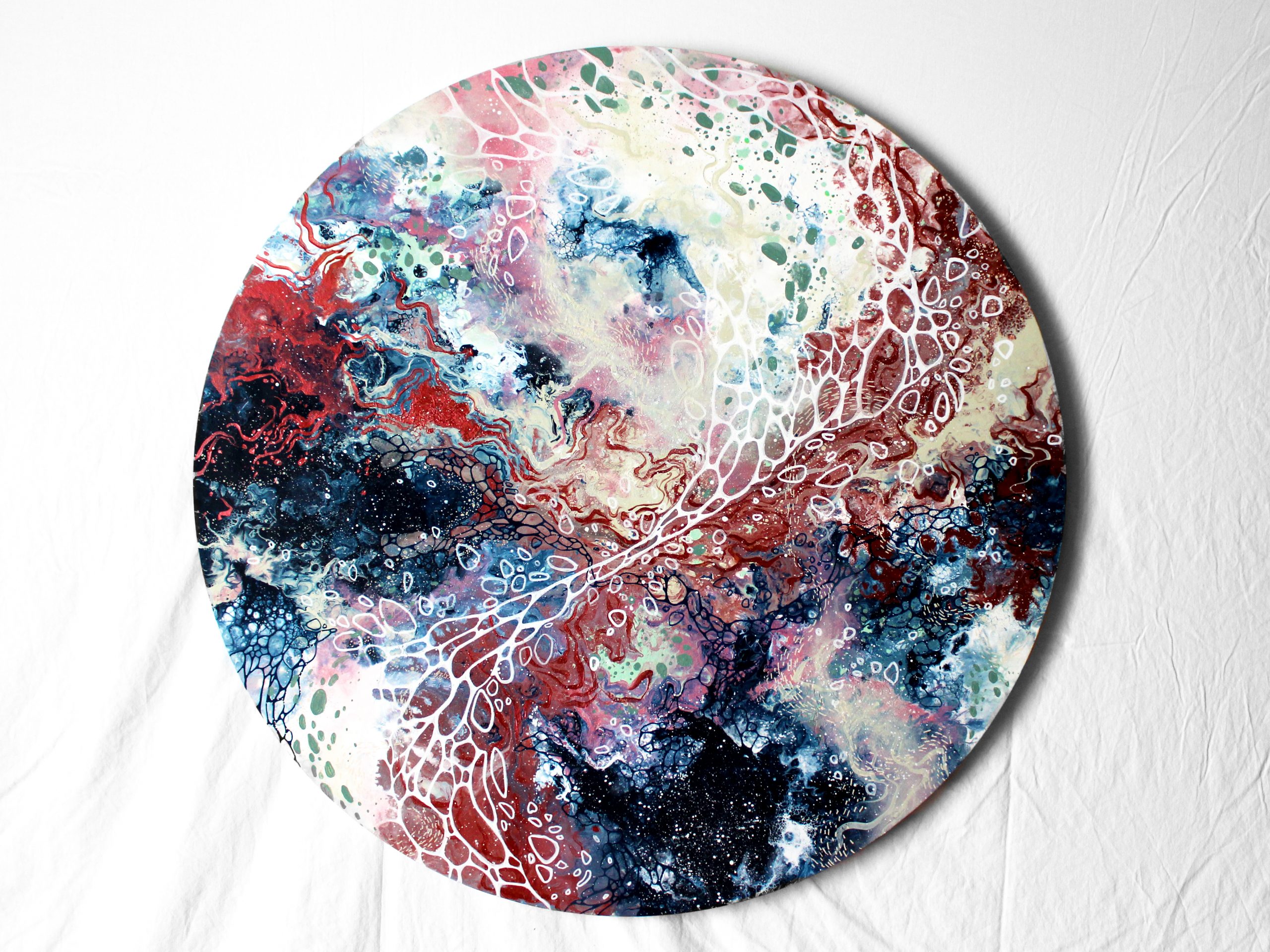 Une commande personnalisée imaginée pour une montée d’escalier. Après quelques propositions de compositions et de couleurs, la cliente a opté pour une grande toile ronde aux couleurs douces et calmes. Placée au milieu de ce mur, elle est visible depuis le rez-de-chaussée mais aussi depuis l’étage. C’est un vrai plaisir d’avoir pu créer une toile pour un si bel espace . J’ai choisi le titre en fonction de ce que les formes et couleurs m’évoquaient : un paysage rêvé et imaginaire.